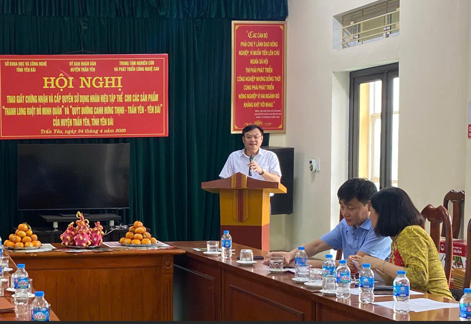 Ngày 24/4/2025, Trung tâm Nghiên cứu và Phát triển công nghệ cao là đơn vị thực hiện dự án đã phối hợp cùng UBND huyện Trấn Yên, phòng Nông nghiệp và Môi trường huyện Trấn Yên, phòng Kinh tế hạ tầng và Đô thị huyện Trấn Yên, UBND xã Hưng Thịnh và Hợp tác xã Cây ăn quả Hưng Thịnh tiến hành tổ chức Hội nghị “Trao quyền sử dụng nhãn hiệu tập thể cho sản phẩm “Quýt đường canh Hưng Thịnh – Trấn Yên – Yên Bái”.