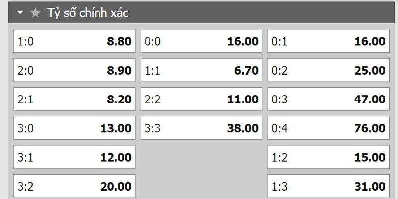 Kèo tỷ số chính xác yêu cầu người chơi dự đoán đúng số bàn thắng mà hai đội ghi được.